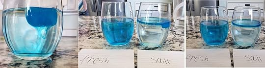 A homeschooling mother, Leah, recently shared a variation that she and her son, Parker, made to this experiment, and it is pictured above. They made ice cubes out of water that had blue food coloring in it. The first picture on the left is of the ice cube in freshwater. You can clearly see the cold water from the melted ice cube sinking in the warm freshwater. The middle picture shows you both ice cubes, and it is really clear that the water coming from the melting ice cube is floating on the saltwater, while it is mixing well with the freshwater. The last picture shows you what is left after both ice cubes melt. Once again, you can see that the water from the ice cube has mostly stayed floating on the saltwater.