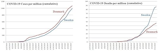 In a comment on a previous post about COVID-19, John D. said that he was watching Sweden and Denmark to evaluate whether or not shutting down most of society is an effective strategy against the disease. Why? Because they are very similar countries in the same basic region of the world, but they have remarkably different responses to the disease. Denmark has instituted many social-distancing strategies against the disease, while Sweden has not. Comparing how the disease is affecting those two countries might tell us something about how effective these strategies really are.