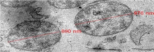 The transmission microscope image above comes from the study. Each oval is made by the structure that surrounds the mitochondria. The red lines show the longest dimension of the oval, and the numbers tell you how long it is. The “nm” unit means billionths of a meter, so these ovals are 0.890 and 0.978 µm across. That makes them bigger than the mitochondria, but still much smaller than blood platelets. The mitochondria, which are difficult to see, are the darker shapes contained inside the ovals.