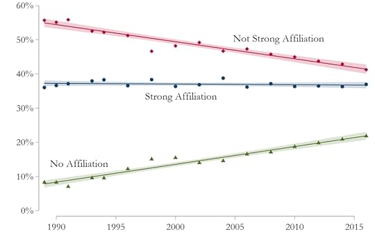 It’s rather easy to see what has happened when it comes to religious affiliation: Many of those who did not strongly affiliate with a religion simply “dropped out.” However, the percentage of Americans that are strongly affiliated with a religion has not changed significantly over this 28-year period.