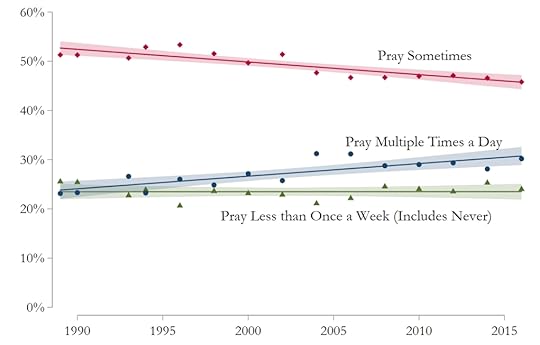 The paper has several similar graphs, but I would like to share one more. The Survey asks how often the respondent prays. The options have changed a bit over this time period (for example, “never” was added in 2004), but grouping the respondents into one of three categories leads to these results: