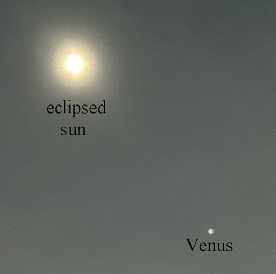 The camera doesn’t do well with the glare, so it’s hard to see the moon. If you look closely, however, once the ball of light gets small, you can see a dim disc inside it. That’s the moon. The small dot you see below and to the right of the sun is Venus. My daughter (Dawn Perdue) got a great shot of it: