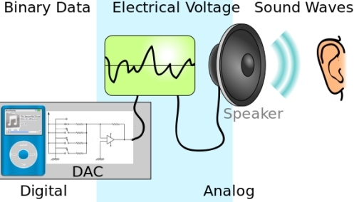 Suppose you want to listen to some music. You pull out your iPod or your phone, put the earbuds in your ears, and you start to enjoy your favorite tunes. You probably don’t think about the process that makes this possible: digital-to-analog conversion. Computers and devices based on them store all of their information digitally. On your iPod or phone, the music is stored as a string of 1’s and O’s. The 1’s represent electricity being on, and the 0’s represent electricity being off. So as your iPod or phone “plays” the music, it comes out digitally: as pulses of electricity, either on or off.