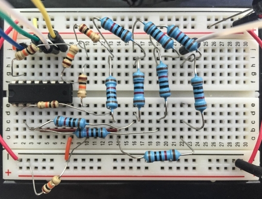 If you tried to listen to those pulses, they would make no sense to you, because your ears aren’t designed to hear things digitally. Instead, they are designed to hear sounds in a continuous flow. We call this analog. So while your iPod or phone stores music digitally, it must convert that music into a continuous, analog signal so that you can understand it. It does this with an electrical circuit called a digital-to-analog converter (DAC). Here is a picture of a simple one (click it for credit):