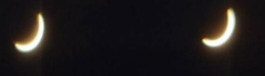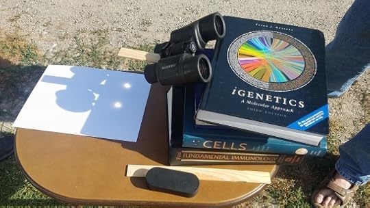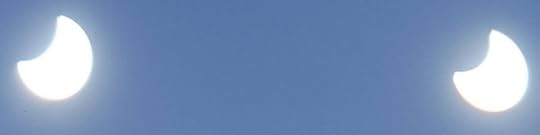In my opinion, however, the best way is through projection. In my elementary science book, Science in the Beginning , I show students how to use binoculars to project the sun onto a white surface. Of course, you should never look at the sun through the binoculars! However, you can point the binoculars towards the sun while aiming their eyepieces at a white surface, such as what is shown in the picture on the left. The white circles on the paper are the sun. You can adjust the focus of the binoculars to make the circles nice and sharp. Obviously, having a tripod upon which you can mount your binoculars is best, but as you can see from the picture, you can set up a makeshift holder using heavy books and a ruler.Interestingly enough, however, you don’t need to make something as complicated as the setup shown on the left or even a pinhole projection camera such as what is discussed in the link above. In fact, a plain kitchen colander will project multiple images of the sun. Just put a colander between a white surface and the sun, as shown in this video. The holes in the colander will project the sun on the white surface, and you can watch multiple images of the eclipse. Adjusting the distance between the white surface and the colander will adjust the focus of the images. Aristotle (384-322 BC) was the first to record this method of viewing an eclipse. He also noted that you can simply look at the ground under a tree that has broad leaves. You will see multiple images of the eclipse happening on the ground, as projected from tiny openings in the tree’s foliage. I confirmed this during the 1999 solar eclipse pictured at the top of this post.