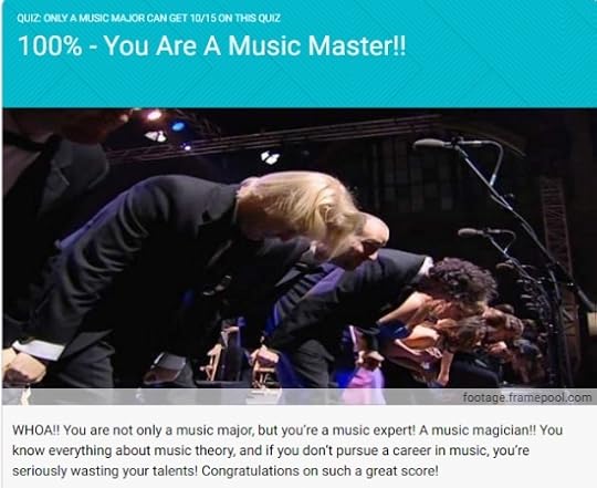 In any event, because some people think of me as a musician, I often get tagged in Facebook posts that deal with music. Such was the case a few days ago. A good friend of mine tagged me when she posted the Facebook quiz pictured above. As you can see, the quiz says, “Only A Music Major Can Get 10/15 On This Quiz.” My friend was happy, because she had scored 100%. At first, I didn’t take the quiz at all, because my knowledge of music theory is incredibly weak. However, my friend tagged several others, and many of them took the quiz. Nine of them posted their results, and all of them got 100%.