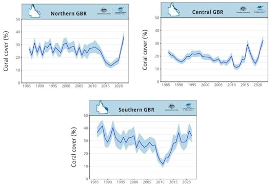 Probably the most reliable source on the state of the GBR is the Australian Institute of Marine Science. Every year, it does an extensive survey of the GBR and publishes its results. The study splits the GBR into three specific regions (Northern, Central, and Southern). I showed the results from last year’s survey about a year ago. Here are the results of this year’s survey: