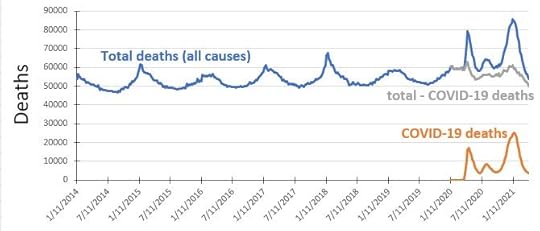 What can we say about the fact that even after subtracting out the COVID-19 deaths, there are still more deaths in 2020 and 2021 than the previous years? As I see it, there are two possibilities. It’s possible that COVID-19 deaths are being under-reported. It’s also possible that the COVID-19 measures that have been instituted have produced some deaths as well. I think the second option is more likely. Social isolation, delaying doctor appointments, etc., will result in more deaths. However, the number of those deaths is small compared to the COVID-19 deaths.