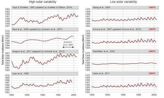 I used the top two graphs to make the illustration that appears at the very top of the post. As you can see, the eight reconstructions are arranged so that the ones which show a high variability in TSI are on the left, and the ones which show a low variability are on the right. What about the “CMIP5” that shows up on low-variability graphs. It indicates that those were the graphs used in the IPCC’s Climate Change 2014 Synthesis Report, which I quoted above.
