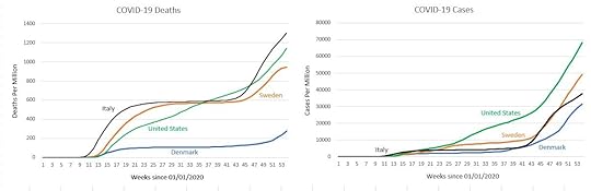 By fall, there were those who thought the strategy had worked. Case rates were falling, and Sweden seemed to have weathered the storm. However, in my August post, I said that Sweden had not reached herd immunity, and it turns out that I was right. If you look at the above graphs (data from the European Centre for Disease Prevention and Control), you will see that while both Sweden and Denmark saw a leveling off in the summer and early fall, COVID cases and deaths quickly shot up later on. To date, Sweden’s COVID-19 deaths per million are more than three times that of Denmark’s, and right now, there is no indication that either country will see a slowdown in cases or deaths, at least not until the vaccines are widely distributed.