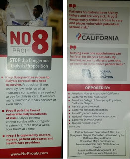 The flyer above says, “California Proposition 8 sets severely low limits on what insurance companies are required to pay for dialysis care… These limits do not cover the cost...forcing many dialysis clinics to cut back services or even close.”