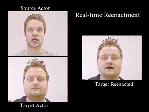 Real-time Expression Transfer for Facial ReenactmentGraphics research paper from Stanford University demonstrates a method of transferring the expressions of one person’s face to the other in realtime using depth cameras: