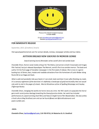 Apocalypse The Memoir by Chantelle Oliver is a memoir about the events of 1987 when the author raced across America to search for her father. The author is a self proclaimed 90-pound loser who made her way to Las Vegas and tells this story in full and brutal honesty.