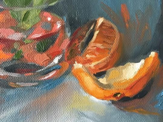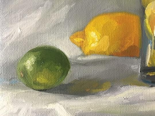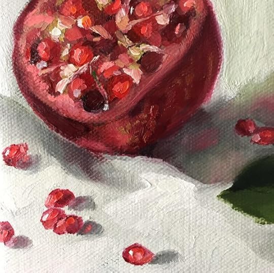 Browse paintings, sketchbooks, prints and books in the studio and watch my progress on the largest still life I’ve undertaken to date. Here’s a clippet showing the development of just a teensy section of the painting: