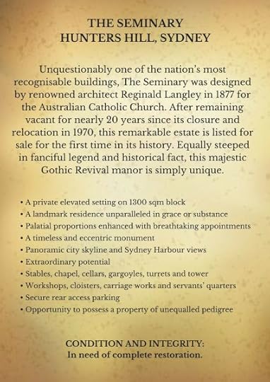 Once again it’s set in a historical part of Sydney. But I’ve been a bit cheeky, folks; taking one of my favourite buildings in Annandale, The Abbey, and relocating it to the leafy and delicious harbour-front suburb of Hunters Hill. The joy of artistic licence, hey?