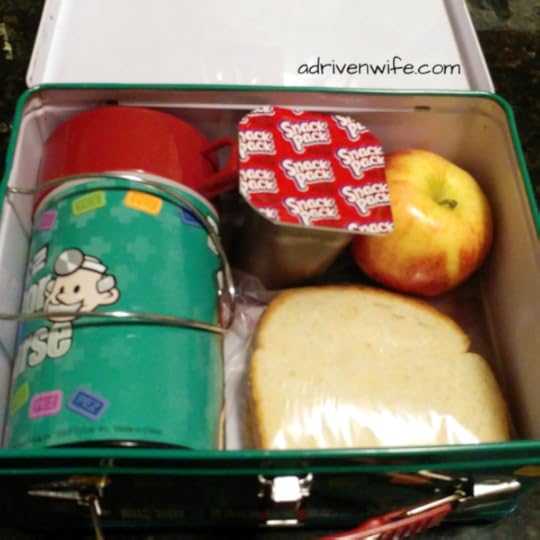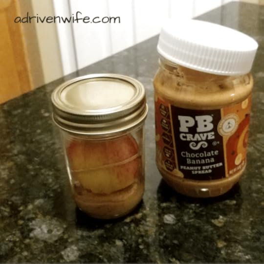 and as a snack, I used Chocolate banana flavored peanut butter with slices of apple, used a rubber band to tie the apples together to prevent the apples from turning brown.