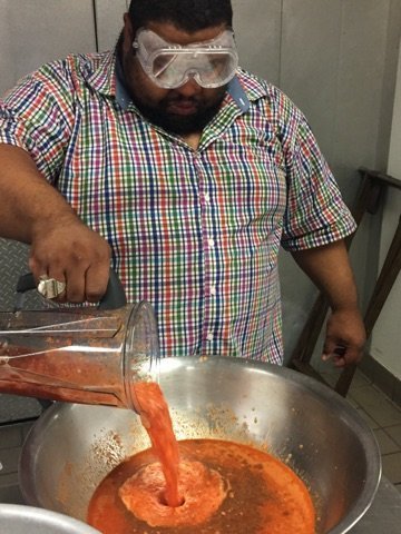 I basically pureed a yellow and a red onion, helped along by a quarter cup of Apple cider vinegar each, added about a heaping tablespoon of ginger puree. I also added a tablespoon each of kosher salt, ground cayenne pepper and red pepper flakes. I then added a teaspoon each of black pepper and kitchen pepper and a half tablespoon of hot paprika. I added half my apple cider vinegar which was about a cup. I blended this this together. I then took the washed, capped peppers (about 20 ripe, hot peppers) and blended them in the mixer with the previous mix. I added another 1/2 cup of apple cider vinegar and about 1/3 cup of dark rum and hit blend again and adjusted for taste. A little this a little that.
