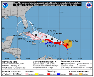 Here is Irma, a Category-Five hurricane barreling towards the Lesser Antilles, projected to arrive off the coast of Florida in three days:
