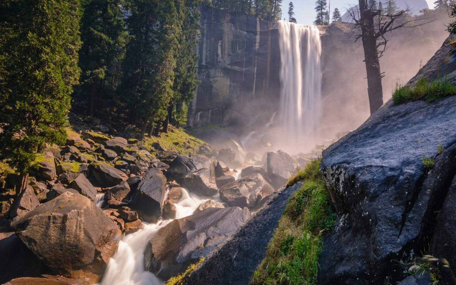 One of the first places Denise and I went together was Vernal Falls in Yosemite. At the end of the trail is a climb to the top of the 318-foot waterfall. It takes almost as long to climb to the top of the fall as it does to reach the start of the switchbacks. I'm not sure how far we went before turning back. The rocks were slick, and we weren't in great shape, smoking, etc. I remember the amazing view, though. It was something like this: