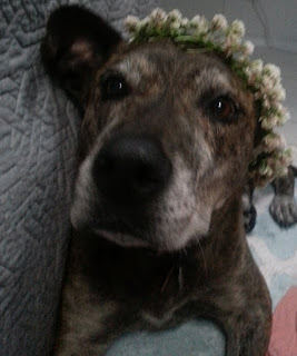 This dog is part of the family. She puts up with posing with flowers and books and Santa hats.