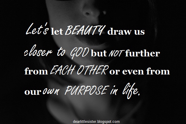 So let’s all take a step back together and re-center on what beauty is supposed to be. Let’s echo Psalm 27 and ask God for the honor of gazing upon the beauty of the Lord. Let’s listen to Peter who says our adorning should be about the person of the heart. Let’s let beauty draw us closer to God but not further from each other or even from our own purpose in life. Let’s stop letting the external outweigh the internal. Your value isn’t there. It’s in the hand of a mighty and beautiful God who died so you could have a relationship him.