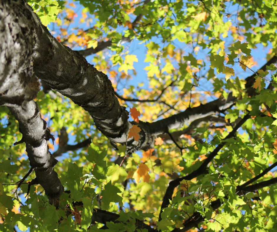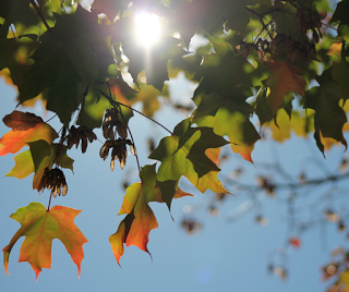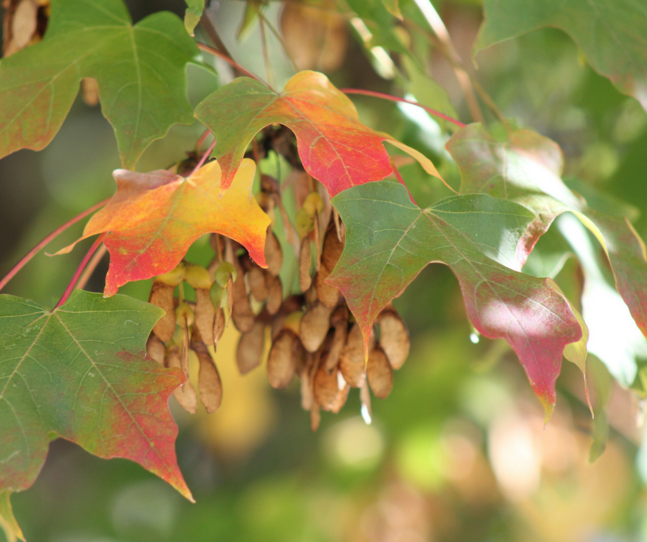 The old maple in our front yard puts on quite a show in fall, but it does so early. While other trees remain green, ours has been dropping orange and red and yellow leaves since August.