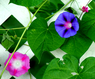 I planted a variety packet of morning glory seeds about three months ago. The heart-shaped leaves appeared, and I started to watch for blooms. The vines grew and grew, lacing themselves up the lattice fence, twirling around the cast iron shepherd’s hook, seeming destined to take over the world.