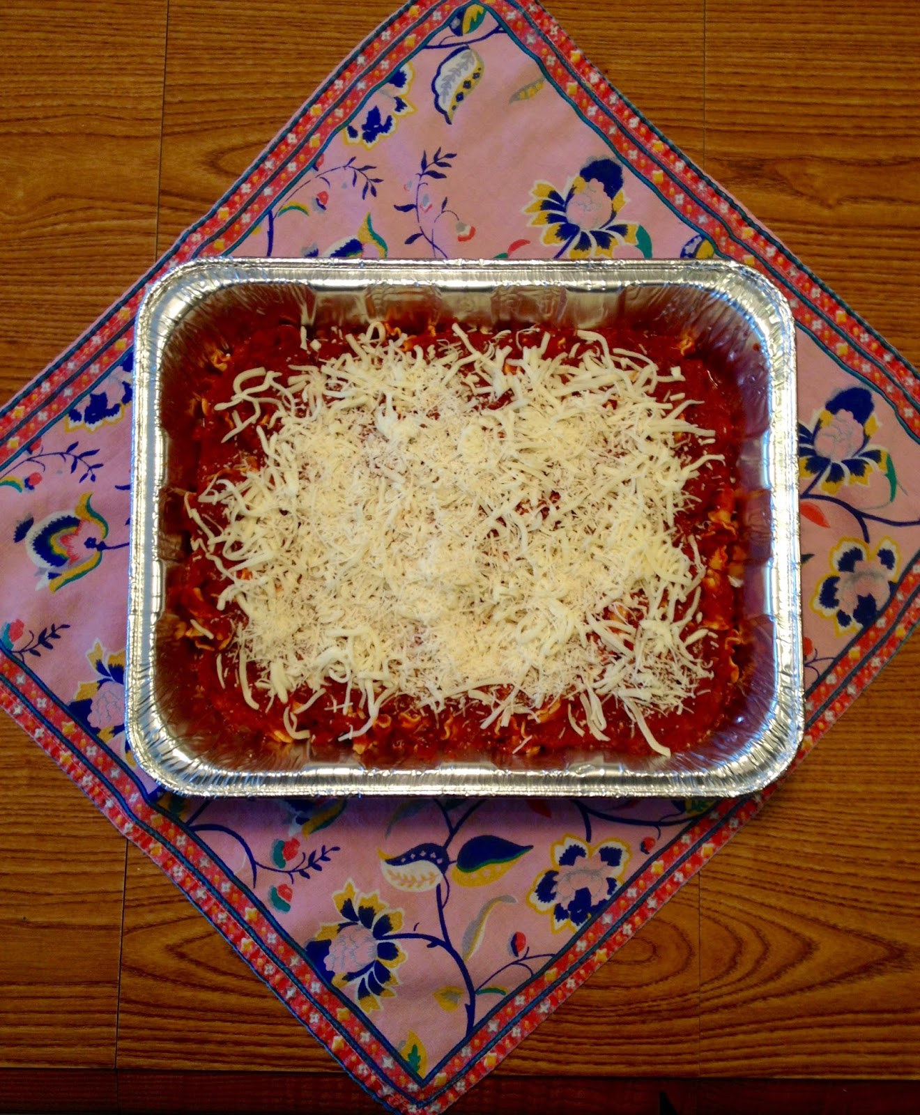 Sprinkle a ¼ cup of mozzarella and provolone across the top of the pasta.