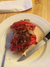 Top with red pepper and a slight drizzle of olive oil. Refrigerate chicken for at least one hour before baking. This allows the breading to dry a bit and adhere to the meat.