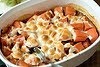 Drain the potatoes in a colander. Cut large pieces in half. Lay potatoes into a 13x9 inch glass baking dish.
