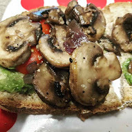 Toasted bread with avocado, sautéed mushrooms, and sliced grape tomatoes.