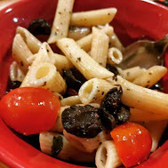 Pasta seasoned with olive oil, black olives, cherry tomatoes, and a sprinkling of basil.