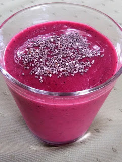 Combine all ingredients in a blender except chia seeds. Blend until smooth. Top with chia seeds and extra fruit if desired. Makes 1 serving.
