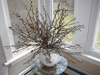 Recently I overheard a patron mention his willow tree had budded, a sure sign of Spring. I felt a rush of panic. No! I couldn’t be late to harvest the silver buds before the catkins appeared. Whereas the little kitties are sweet, they do not stay on the branches very long. Harvested early, the decorative silver buds will be around as long as you like. Spring finds my vases full.Once pretty willow shrubs lined our service road and supplied me with an abundant harvest, but borers found and riddled the trunks. I am pinching myself to remember to plant twigs to start them all over. In Spring, when the soil is saturated, a willow branch may be rooted by simply sticking it in the ground where you’d like a nice shrub. Careful. Some consider it invasive. Often willows are planted on the banks of streams and ponds to prevent erosion because the roots are abundant and healthy. (‘ware the borers!)