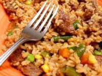 Put the cubed venison back in the frying pan, add water, onion powder, garlic salt, bouillon, rice, and mixed vegetables. Stir. Make sure the rice is immersed in the liquid. Add more liquid if necessary.