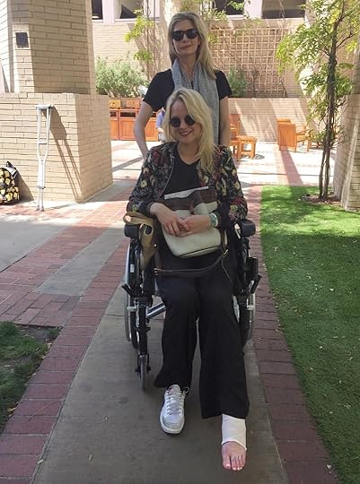 "What a gift for those of us who are usually being carried to get to help carry others. (photo of me pushing my youngest sister, GRACE, in my wheelchair--NOT AMIE, the one in the car accident--after she badly twisted her ankle last night; sadly ironic when the disabled stroke survivor is currently the sister in best shape here!) Wow, these past few days of waiting rooms and hospital bedsides and wheelchair pushing have deepened my sense of empathy and gratitude for all who have entered those same places for me. Thank you, thank you.