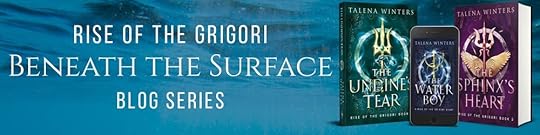 Covers for The Undine’s Tear, The Waterboy, and The Sphinx’s Heart in front of a blue image of the lower side of water’s surface. Text: Rise of the Grigori Beneath the Surface Blog Series