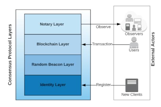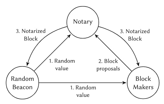 Identity layer (providing a registry of all clients). Random Beacon layer (providing the source of randomness (VRF) for all higher layers including applications (smart contracts). Blockchain layer (building a blockchain via the Probabilistic Slot Protocol driven by the random beacon). Notarization layer (providing fast finality guarantees to clients and external observers).In the network clients fulfill three key roles: participate in the decentralized random beacon, participate in the decentralized notary, and propose blocks. Various phases within the protocol comprise notarization, and finalization. Consensus is achieved when the various players come together to enable these phases.