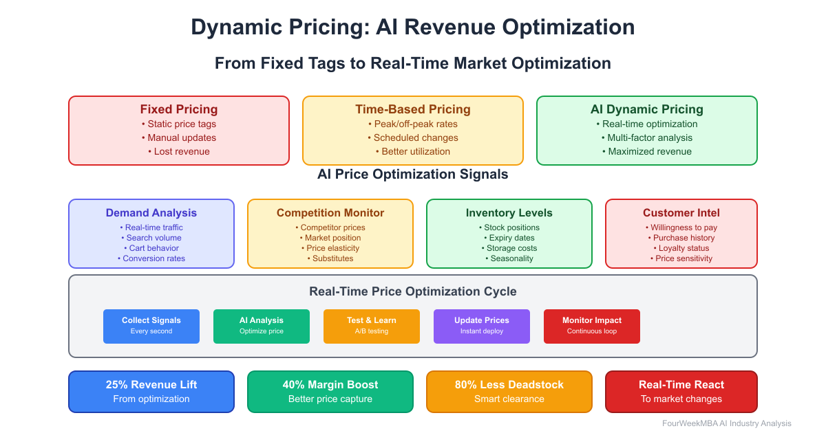 [image error]Business Engineer’s FRED Test helps organizations navigate.wp.com/fourweekmba.com/wp-co...″ data-orig-size=”1200,630″ data-comments-opened=”0″ data-image-meta=”{“aperture”:”0″,”credit”:””,”camera”:””,”caption”:””,”created_timestamp”:”0″,”copyright”:””,”focal_length”:”0″,”iso”:”0″,”shutter_speed”:”0″,”title”:””,”orientation”:”0″}” data-image-title=”dynamic-pricing-transformation” data-image-description=”” data-image-caption=”” data-medium-file=”https://i0.wp.com/fourweekmba.com/wp-content/uploads/2025/09/dynamic-pricing-transformation.png?fit=300%2C158&ssl=1″; data-large-file=”https://i0.wp.com/fourweekmba.com/wp-content/uploads/2025/09/dynamic-pricing-transformation.png?fit=1024%2C538&ssl=1″; src=”” alt=”Dynamic Pricing Transformation” class=”wp-image-167488″/>AI dynamic pricing delivers 25% revenue lift and 40% margin improvement through real-time optimization across multiple signalsThe Hidden Cost of Fixed PricingTraditional fixed pricing represents a compromise that satisfies no one. Set prices too high, and sales volume suffers. Set them too low, and margins evaporate. Even worse, the “right” price changes constantly—what maximizes revenue on Monday morning might lose money Friday evening. Yet most businesses still use pricing set weeks or months ago, missing countless opportunities.