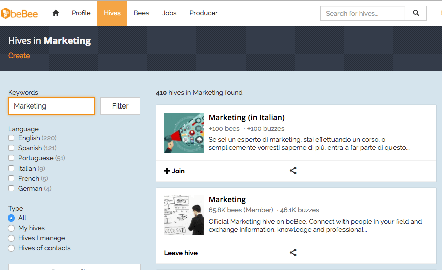 Hives are small communities within beBee that people interested in a certain topic can join. Hives are places where you can build your community by creating content, called Honey or by sharing relevant Buzzes.