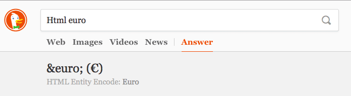 If you’re not a programmer or developer DuckDuckGo is fantastic. It has a solution to any problem. Let’s say you can’t find the € sign code anywhere. Ask DDG!