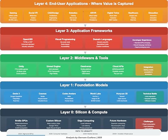 Domain-specific languages for describing worlds and interactionsVisual programming interfaces for non-technical usersStandard formats (OpenUSD emerging as the HTML of 3D worlds)Layer 4: End-User ApplicationsThe visible layer where value is captured: