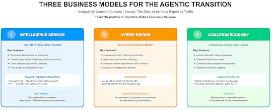 Agent-exclusive content that never appears on the human webPremium human experiences subsidized by machine revenueCross-pollination where human insights improve machine intelligence and vice versaNew content formats designed for human-AI collaborationThe bridge model isn’t permanent, but it provides crucial revenue during the transition and learning opportunities for the full transformation.