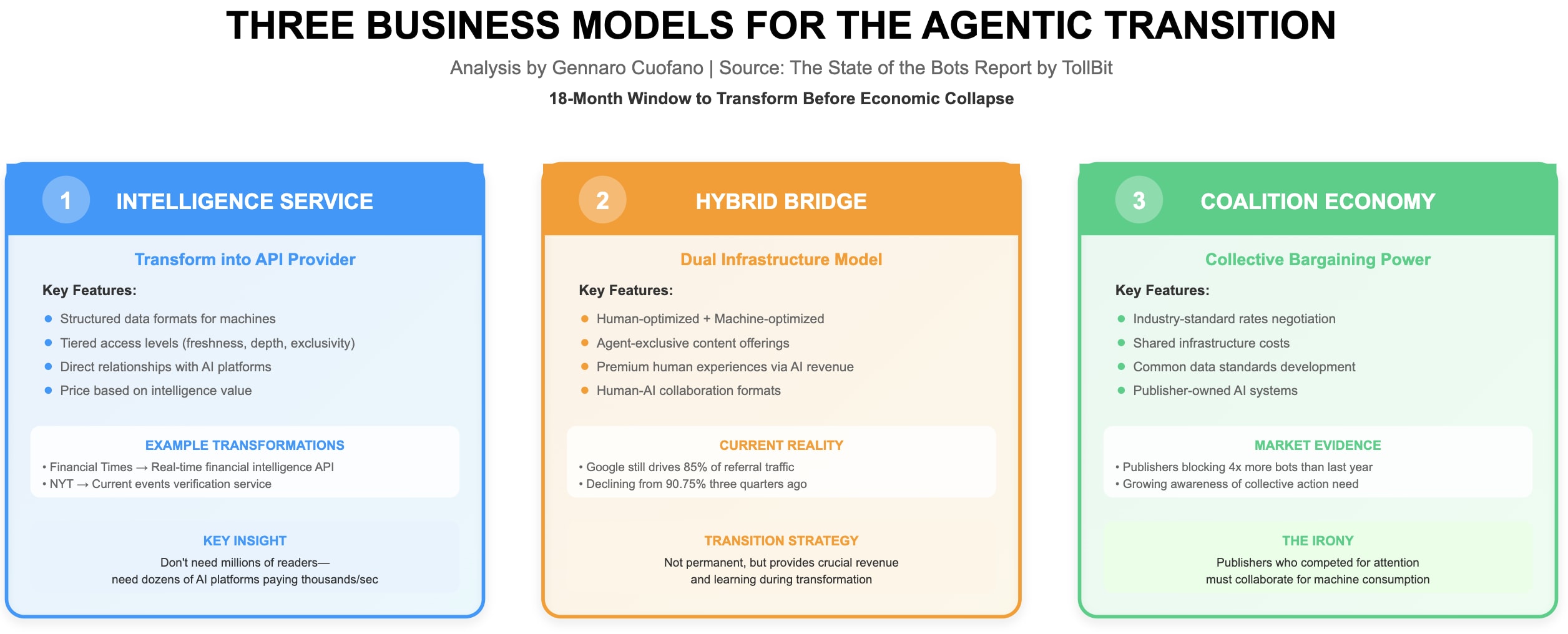Develop structured data formats optimized for machine consumptionCreate tiered access levels based on freshness, depth, and exclusivityBuild direct relationships with AI platforms rather than hoping for referral trafficPrice based on intelligence value, not advertising potentialThe key insight: in the agentic web, publishers don’t need millions of readers—they need dozens of AI platforms paying thousands of times per second .