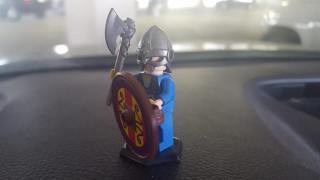 TA DA! Meet Hugo: a Lego-compatible Viking figure, complete with a period battle axe and shield. (This is his happy face. I can turn his head around to have a grumpy Hugo.)