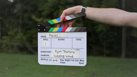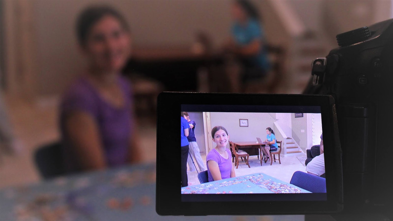 One actor—my brother—isn’t going to be filmed in this scene, and he takes a turn helping the grips set up lights. Other behind-the-scene helpers put up the lights, hold diffusers, and arrange the scene perfectly as the camera op and director give them guidance. The lights and stands are arranged, making the tan wall behind me free of shadows. The puzzle pieces look even more vibrant on the blue tablecloth. I pick one up.