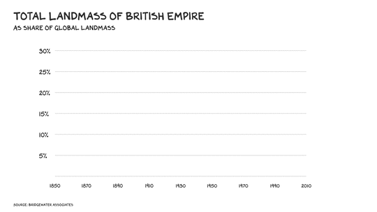 Throughout history, nobody has come close to amassing total control. The mightiest empires were still minority owners of planet Earth. Before her death in 1901, Queen Victoria oversaw a kingdom that spanned roughly a quarter of the globe’s land surface and ruled just 23% of the world’s population. At its peak in 1300, the Mongol Empire controlled about 18% of the Earth. The Roman Empire was even smaller (4%).