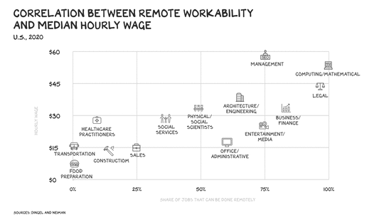 This isn’t a populist uprising, however. The WFH movement is (another) transfer of wealth from the poor to the rich. Money is the transfer of work and time. Research shows people who cannot work at home are more likely to be lower-income, rent their home, lack a college degree or employer-provided health insurance, and be non-white. Uber drivers, Amazon warehouse workers, FedEx drivers, and meatpackers don’t have Zoom accounts. It’s bits vs. atoms, and bits are managed by higher-paid information workers.
