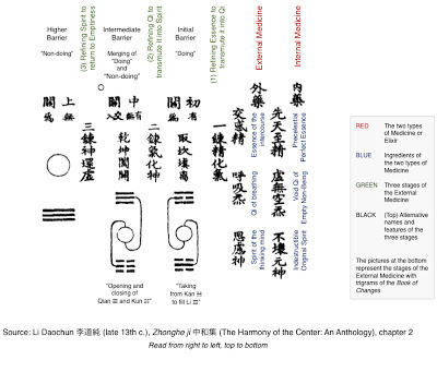 In his Zhonghe ji (The Harmony of the Center: An Anthology), Li Daochun (late 13th century) makes an important distinction between two Elixirs, which correspond to different degrees of realization. The first Elixir is the Internal Medicine (neiyao), and the second one is the External Medicine (waiyao). Li Daochun says: