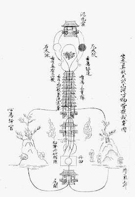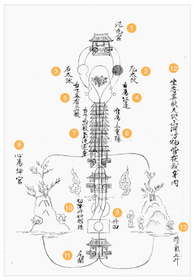 The Japanese alchemical chart of the body reproduced above is entitled Shūshin kyūten tandō zu 修真九轉丹道圖, or Chart of the Way of the Elixir in Nine Cycles for the Cultivation of Reality (the Chinese reading of the title is Xiuzhen jiuzhuan dandao tu). Although no precisely corresponding picture seems to be found in Chinese texts, it is likely that this chart is either copied from, or based on, an earlier Chinese exemplar that may now be lost.